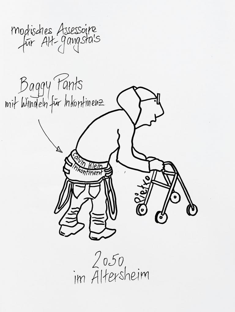 Zurück zum eigentlichen Thema: Unfallursache Nr. 1 der Hippo-Gansta-Homie – Generation im hohen Alter. Die reduzierte Reaktionsfähigkeit und mangelnde Geschwindigkeit beim „Beinspreizverfahren“ werden dazu führen, dass regelmässig alten Männern die Hosen herunterfallen und zu Stolperfallen werden. Das ist kein Witz, sondern schon heute Realität. Mein eigener Vater, keiner dieser beschriebenen Generation, sondern bereits über 80 Jahre alt, überquert nach einem grösseren Einkauf den Zebrastreifen, links und rechts eine Tasche tragend. Was geschieht? Es rutscht ihm die Hose bis zu den Knien runter. Auf beiden Seiten des Zebrastreifens warten Autos auf ihrer Fahrspur. Was tut mein Vater? Er spreizt die Beine und watschelt in kleinen Schritten mit heruntergelassener Hose über den Zebrastreifen auf die andere Seite der Strasse. Das hätte böse enden können. In der Folge trug mein Vater sowohl Hosenträger wie einen Gürtel.