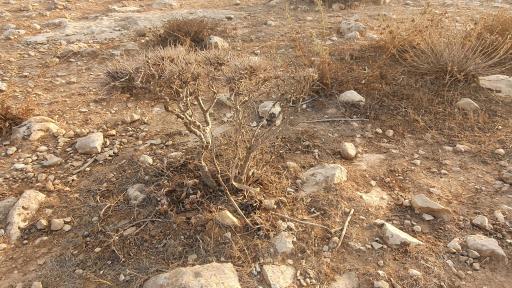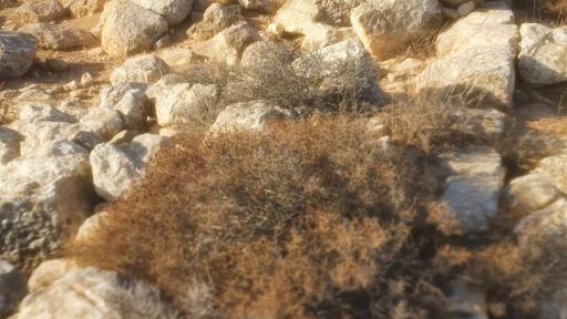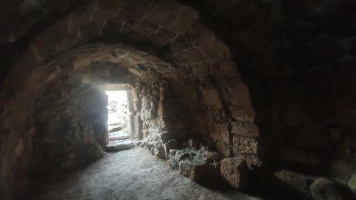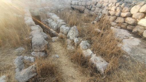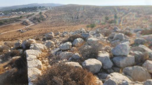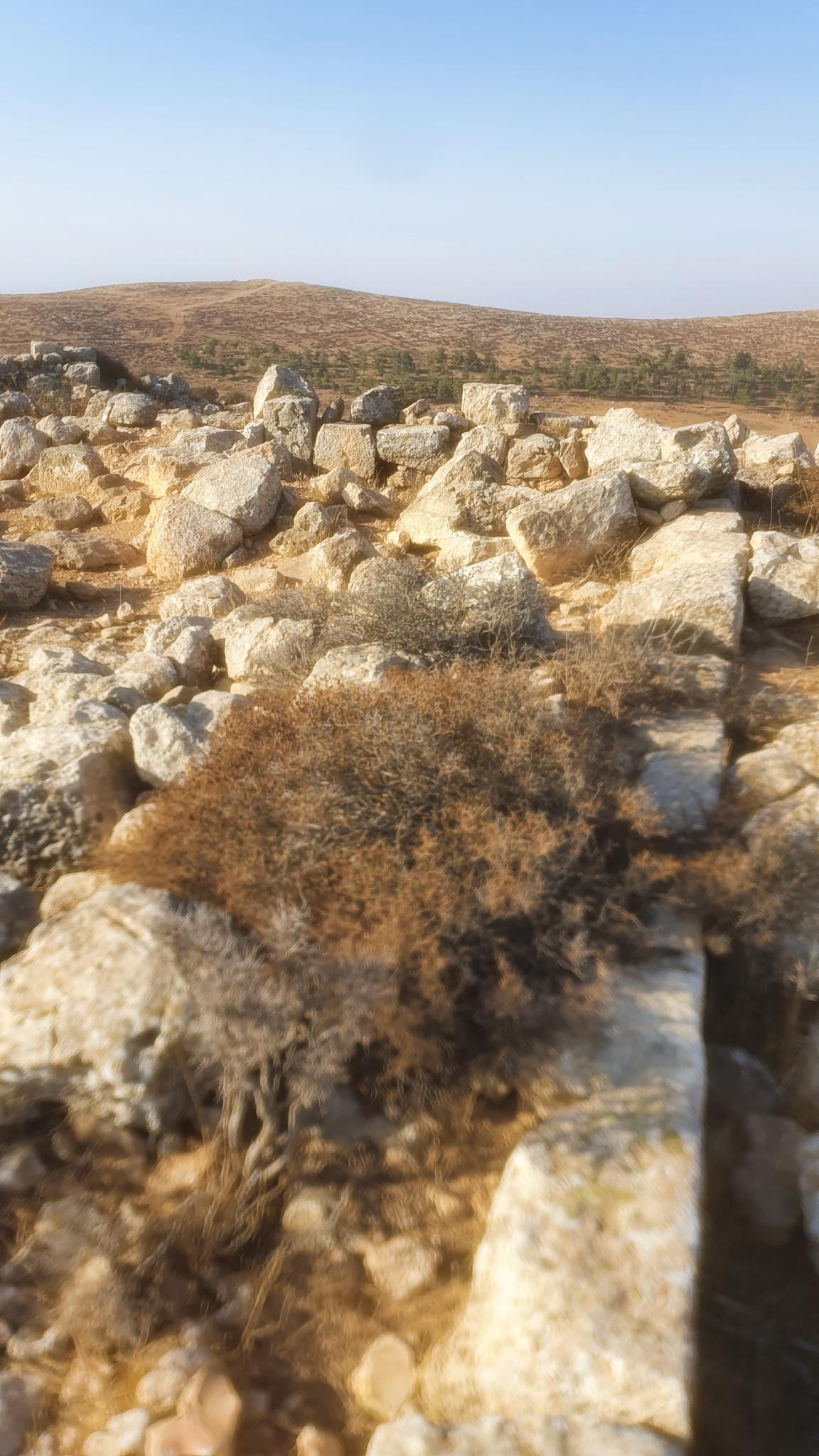 Auf den Hügeln, wenige 100 Meter entfernt, findet man Mauerreste mit behauenen Steinen. Ich nehme an, dass hier auch ein Befestigungsturm zur Nachrichtenübermittlung wie in Khorbat Anim (siehe unten) gestanden ist.