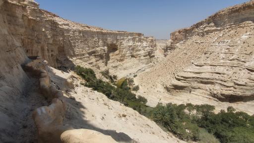 Wasser hat über Jahrtausende eine tiefe, breite Schlucht in das weiße, weiche Kalkgestein geschnitten. Fast senkrecht erheben sich die Gesteinsschichten, ein schmales Rinnsal durchzieht den unteren Bereich des Canyons. Im mittleren Bereich öffnet sich in einem Seitenarm ein großer Pool, der von einem kleinen Wasserfall gespeist wird. Das meiste Wasser dringt nicht sichtbar durch Gesteinsritzen und füllt das Becken. Auch bei Temperaturen über 40° Celsius, ist es wie eine ständige Tränke für Wüstentiere, auch wenn das Wasser leicht modrig riecht und als Trinkwasser für Menschen nicht geeignet ist. Viel Kleingetier lebt darin, auch kleine Krebse. In mittlerer Höhe zieht sich zu beiden Seiten der Schlucht eine schmale, schwarze Gesteinslinie aus Feuerstein, als sei sie von Menschenhand aufgemalt. Im hinteren Bereich der Schlucht, führt ein Wanderweg vorbei an Höhlen, die von den Mönchen während der byzantinischen Periode bewohnt waren.