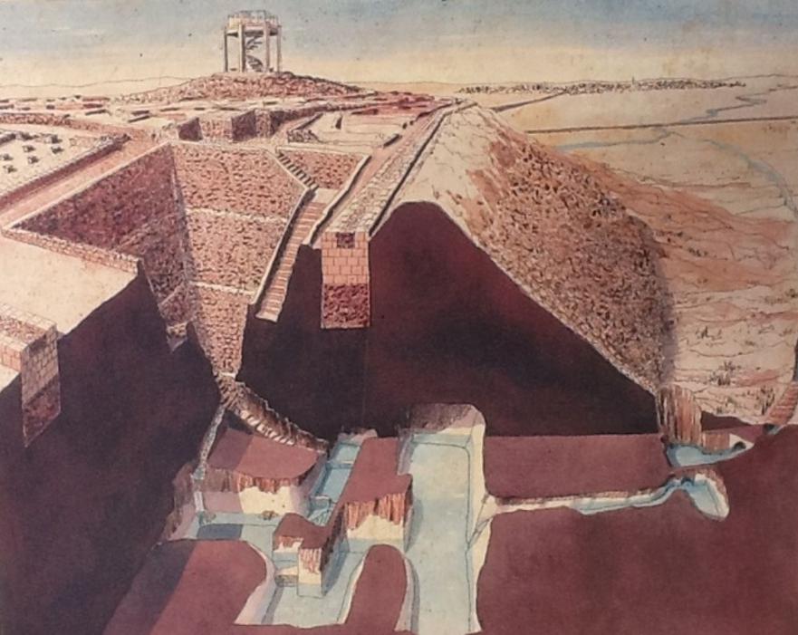 Am höchsten Punkt des Hügels befindet sich eine rechteckige Festung von 21 x 21 Metern, ein Burgwall mit einem Innenhof. Der Turm stand an einem strategisch entscheidenden Aussichtspunkt. Zur Zeit des ersten Tempels wurden im Königreich Judäa eine grosse Anzahl von Befestigungen und Türmen gebaut. Diese dienten zur Kommunikation, als Warn- und Signalposten. Über sie wurden Informationen übermittelt und Geheimdienst Aufgaben wahrgenommen. Von hier aus sieht man im Norden bis zu den Hebron Bergen und im Süden den Negev. Damals vermittelte man Nachrichten tags über mit Rauchsignalen und nachts mit Feuer. Die Türme waren Teil der Verteidigungsstrategie.