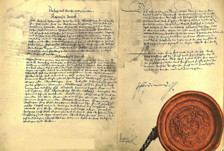 Die beiden Schlusseiten des Augsburger Religionsfriedens mit Unterschrift und dem Siegel Kaiser Ferdinands I., Wien, Staatsarchiv