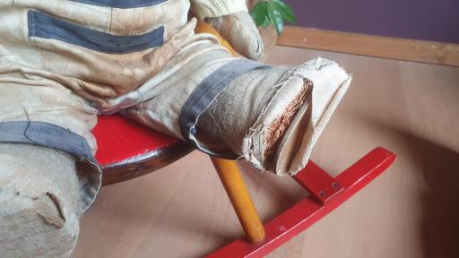 Diese Begegnung mit meinem alten Spielgefährten hat mich erschreckt. Er sieht entsprechend arg strapaziert aus: ausgerissene Augen, abgerissenes Ohr, zugenähter Bauch. Selbst die Sohlen fallen auseinander - wobei: Ich kann mir nicht vorstellen, dass der so viel laufen musste. Jedenfalls hat mein Teddy einiges durchgemacht. Ich glaube, er musste für vieles hinhalten, was in meinem Leben nicht so war, wie ich mir das so vorgestellt hatte. Da muss sich viel Wut in mir angestaut haben.