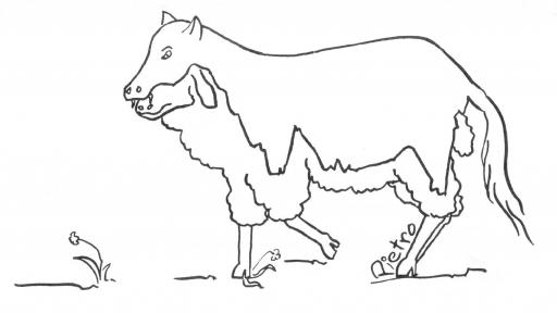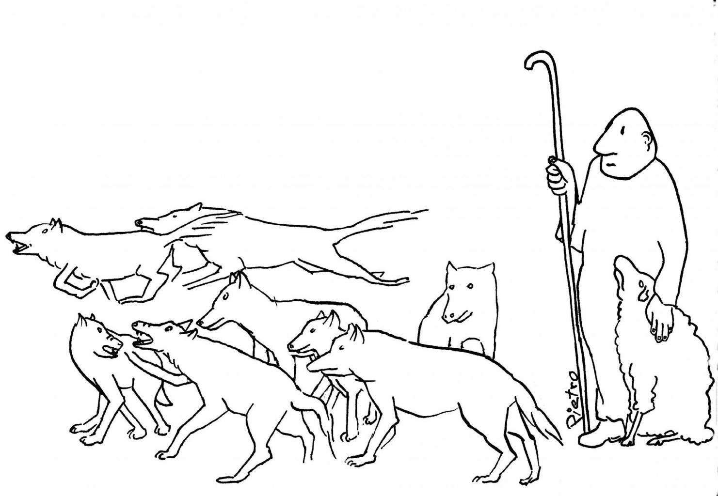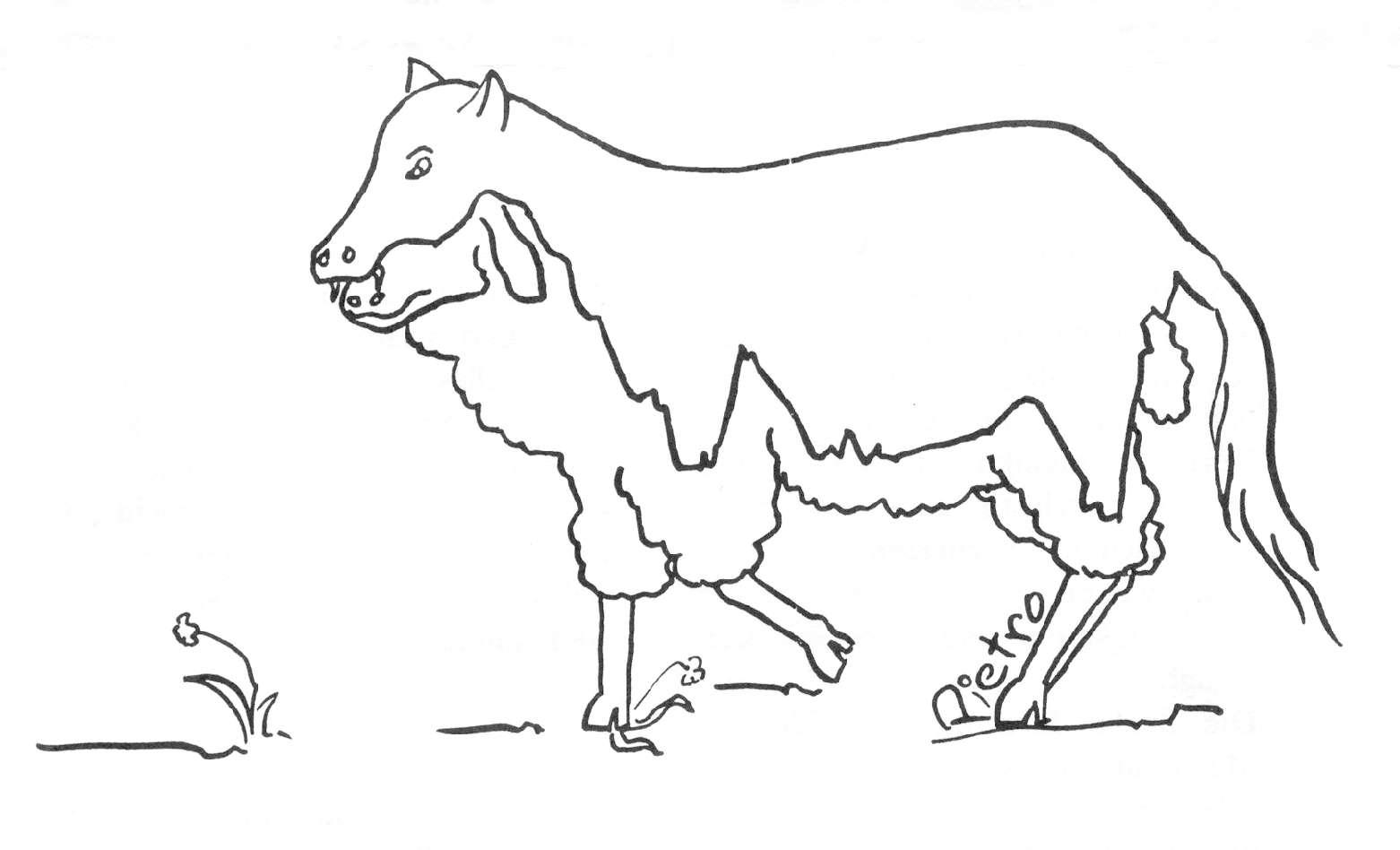 Alles ist verdreht. Wo das Schaf ist, steht normalerweise ein Hund. Das Schaf nimmt auch eine Haltung ein, wie ein Hund. Wo Wölfe sind, wären normalerweise Schafe, eine ganze Herde.